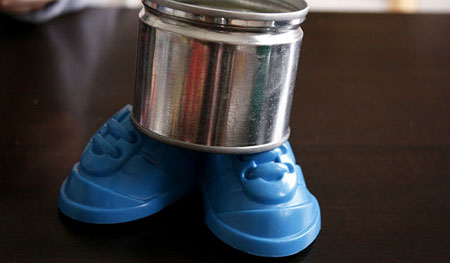 کفشهای عروسکی که در اینجا استفاده کردیم، به کاملتر و شخصیت دار شدن طرح کمک میکند و علاوه بر آن آبی که داخل سبزه ها ریخته میشود و از قوطی خارج میشود را در خود نگه میدارد.